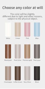 White color ,light beige ,Wood grain ,Silver gray ,Pearl Gray ,Champagne color ,Coffee Brown ,Black color |